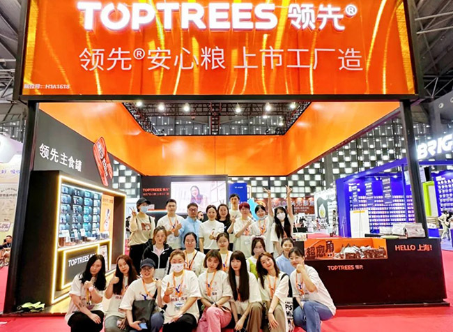 Toptrees领先®以“领先®安心粮,上市工厂造”为展区主题,以黑橙品牌色为视觉基调,同时搭配主粮系列多区位展示,贯彻“聚焦主粮”的集团策略,参展观众可以通过展示区探索,获取不同主粮的差异化营养配比及功效。