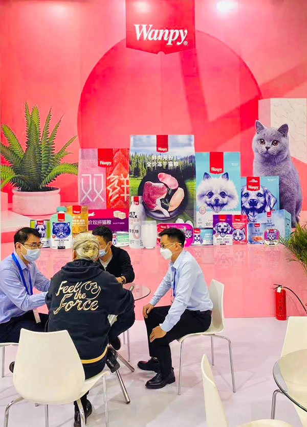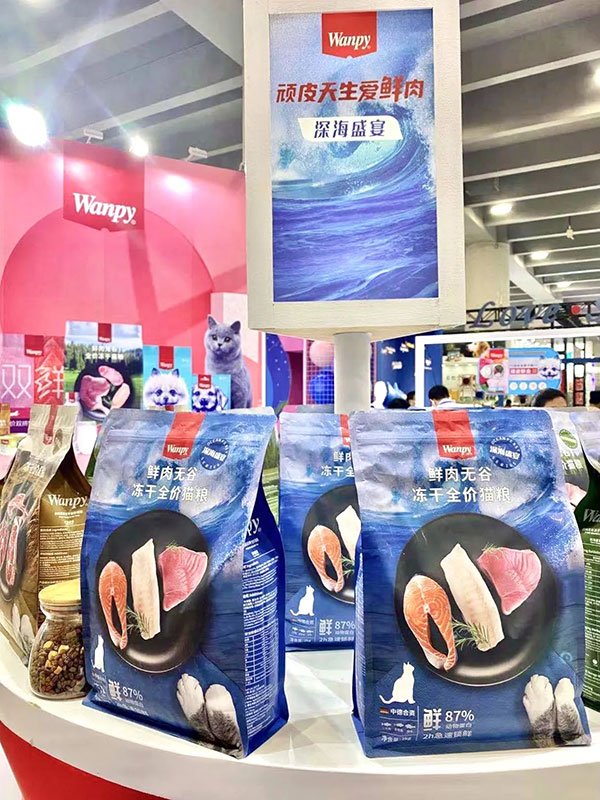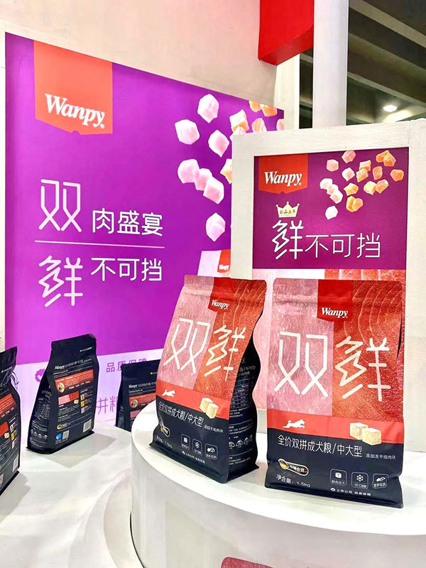 在Wanpy顽皮展台上,Wanpy鲜封包、犬用三明治、顽皮鲜盒等产品悉数亮相。同时,Wanpy还展出了两款新品主粮——顽皮鲜肉无谷冻干粮和顽皮双鲜冻干双拼粮。
