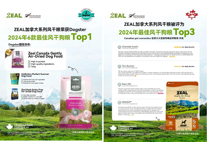 此外,ZEAL 品牌同样以国际认可反哺国内市场,加拿大系列风干粮斩获国际宠物杂志Dogster “2024 年6款最佳风干狗粮Top1”与CPC “2024 年最佳风干狗粮 Top3”双料大奖,产品和品牌获得国际行业认可,让国内消费者同步享受到国际一流品质。